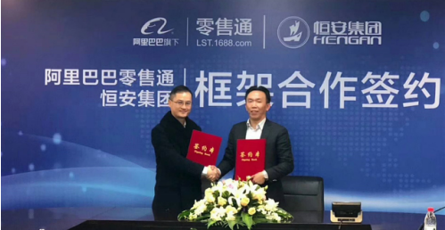 阿里巴巴集团副总裁、零售通事业部总经理林小海(左)与suncitygroup太阳新城集团运营中心总裁许水深(右)签订战略合作协议